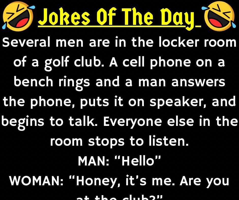 Several men are in the locker room of a golf club. A cell phone on a bench rings and a man answers the phone, puts it on