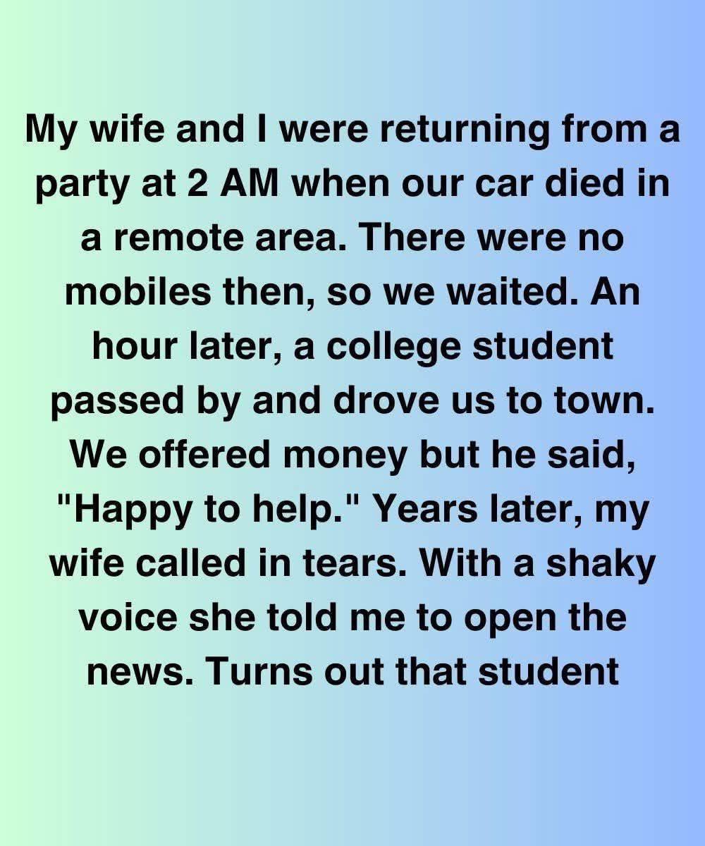 It was a chilly night when my wife and I found ourselves stranded on a desolate road after a party. Our car had died at