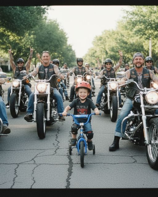 So if you ever see a pack of bikers surrounding a tiny bicycle with flame stickers and streamers, don’t laugh. You’re watching presence. You’re watching people rewrite the ending for a kid who almost believed he wasn’t worth standing up for—and maybe the beginning of a kid who’ll grow up knowing exactly how to ride beside someone else.