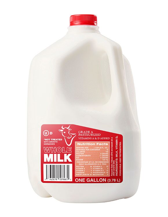 Cap color can sometimes indicate fat content — blue for 2 percent, red for whole, etc. — depending on the brand and region.