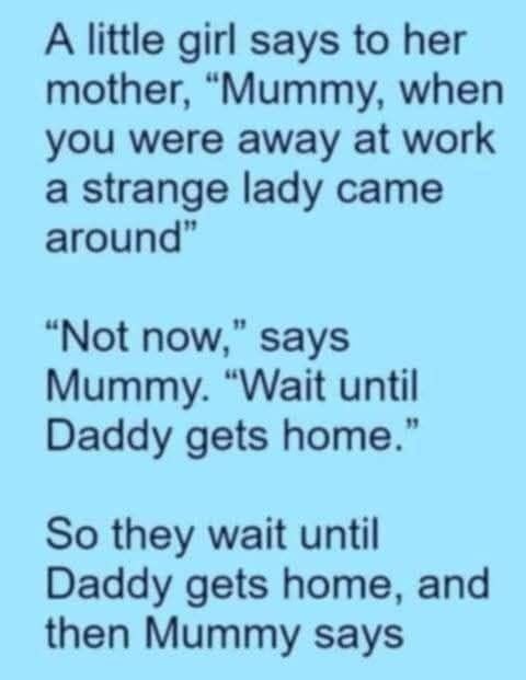 Filled with curiosity, the mother asked, “And what happened next, my dear?” Without hesitation, the little girl confidently replied, “Then they did what you and Uncle Jack did when Daddy was in Vancouver last year.”