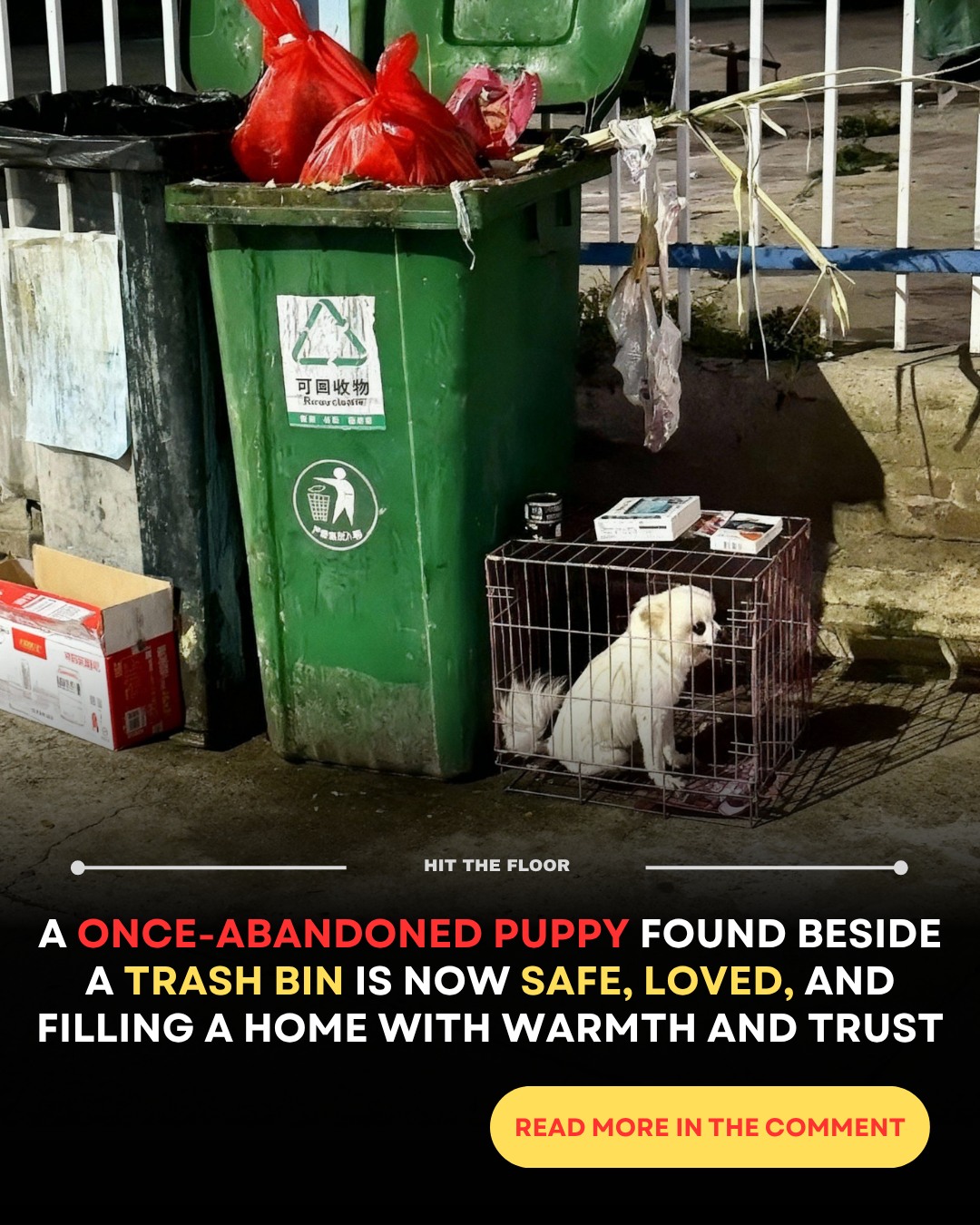 Wedged between the steel bin and a sagging fence was a small wire cage. Inside it, pressed against the bars with matted fur and trembling limbs, sat a tiny white puppy: terrified, abandoned, and clinging to hope in the shadow of garbage.