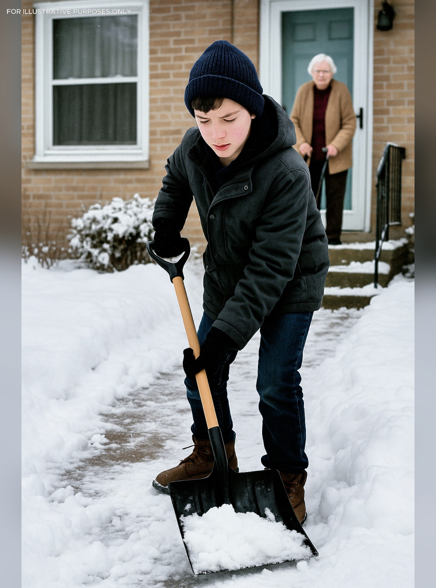 From the window, he could see the snow piled high on his neighbor’s driveway — a steep, uneven path leading up to her small porch. Mrs. Gladys Martin, who lived alone, was in her late seventies. She moved slowly, her frame hunched, and she used a cane after a bad fall the winter before. Marcus had never forgotten the sound of the ambulance sirens that day.