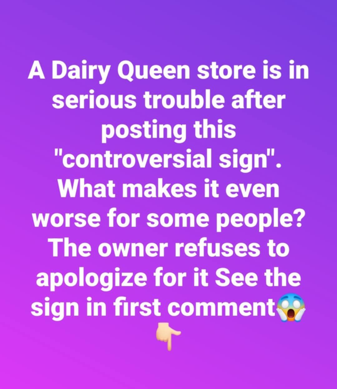 The residents of Kewaskum, a small town, appear to take the sign at face value and interpret it as the owner’s expression of beliefs. Officially, Dairy Queen said that Scheunemann’s strategy is not supported by the corporation and that the sign just expresses the opinions of this one proprietor.