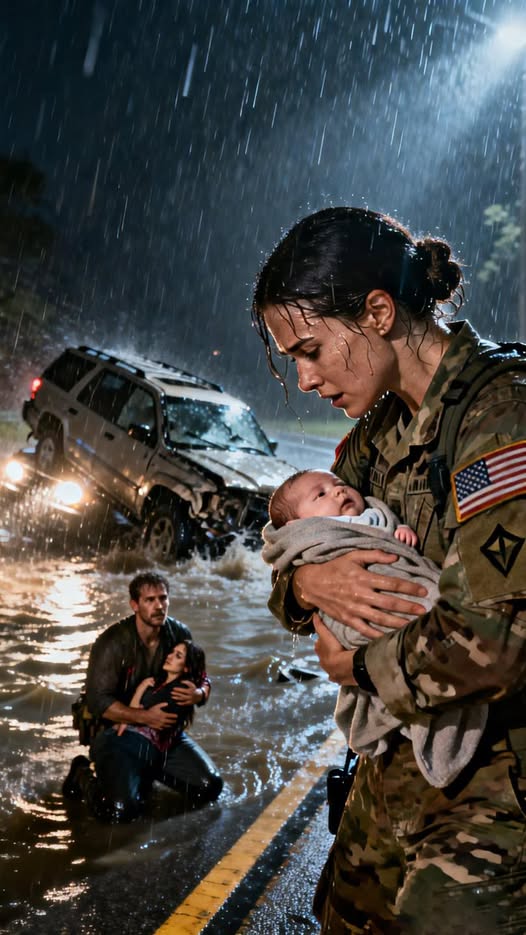 Suddenly, the high beams of my five-ton mechanical beast swept across the muddy shoulder. A civilian SUV lay mangled on its side, half-submerged in a swirling eddy of ink-black floodwater. A man stood in the deluge, his arms flailing with a frantic, primitive desperation. Through the cracked window of the sinking vehicle, I caught a glimpse of a woman. She was huddling over a child whose lips had turned a terrifying shade of cobalt blue.