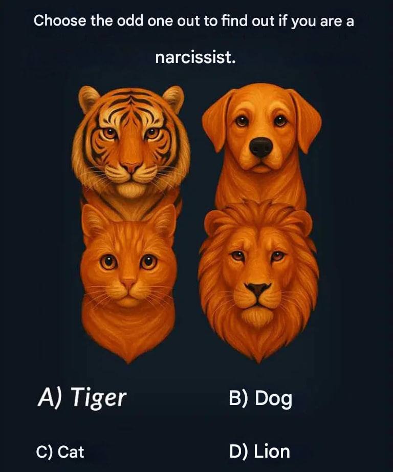 At first glance, this picture looks like a simple puzzle – four animals, one of which doesn’t seem to fit: tiger (A), dog (B), cat (C), or lion (D). But according to popular psychology quizzes circulating online, the animal you identify as the one that doesn’t belong could reveal something deeper about your personality – even hinting at traits like self-confidence, empathy, or narcissism.