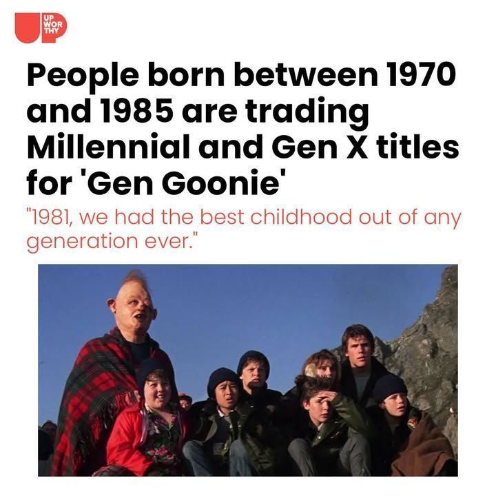 This experience isn’t completely limited to Gen Xers; some older millennials also experienced this type of freedom. Because kids born between 1970 and 1985 had a very specific experience, some born in this era have taken to calling themselves Generation Goonie, after the 1985 film, “The Goonies” starring Sean Astin, Josh Brolin, Key Huy Quan, and Corey Feldman.