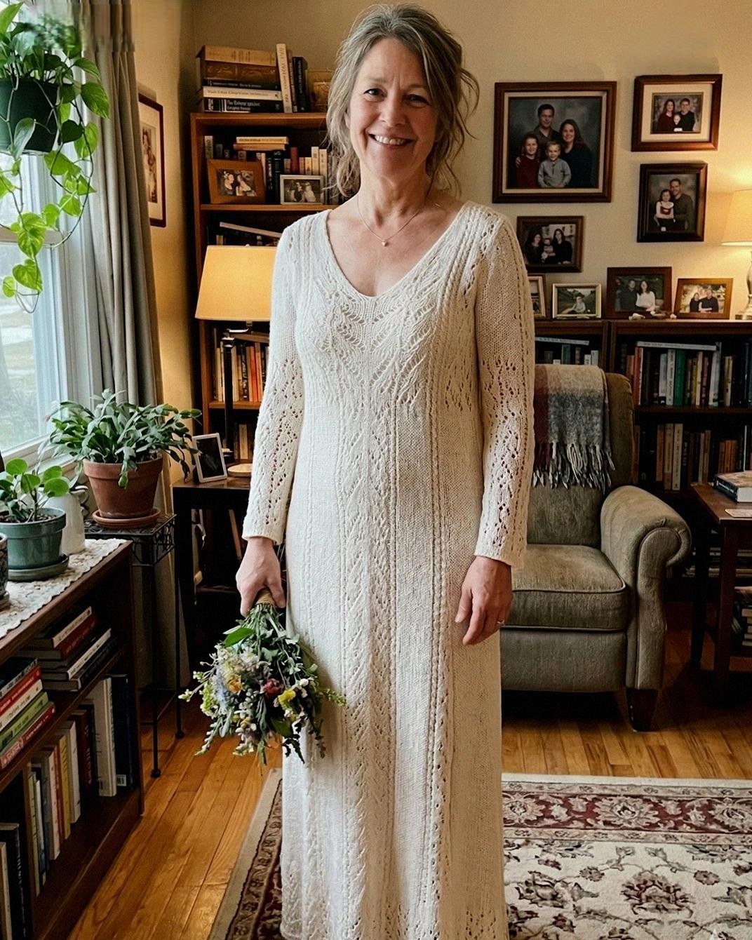 For a year, I snuck away to the rhythmic clack of needles. I wasn’t just working with ivory yarn; I was knitting a record of our lives. I hid our children’s initials—Marianne, Sue, and Anthony—into the hem. I painstakingly recreated the lace pattern from the first curtains we bought for our studio apartment and mirrored the delicate scallop of her original wedding veil. Every stitch was a prayer for her recovery. When I finally laid the finished gown across our bed and asked her to marry me again, her tears told me she saw exactly what I had intended: a lifeline.