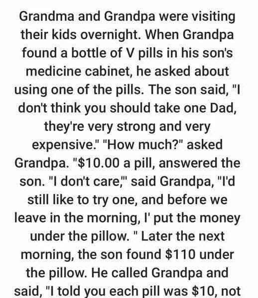 Grandma and Grandpa were visiting their kids overnight.When Grandpa found a bottle of V pills in his son’s medicine cabinet, he asked about using one of the pills.