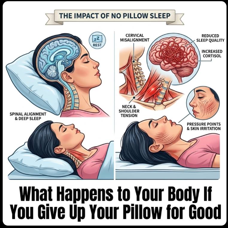 Most pillows fail to keep your neck in an optimal position, often bending it at awkward angles. Whether too firm or too soft, an ill-fitting pillow can contribute to stiffness and discomfort. Without a pillow, your neck aligns more naturally with the rest of your spine, which may help prevent pain and improve posture over time.