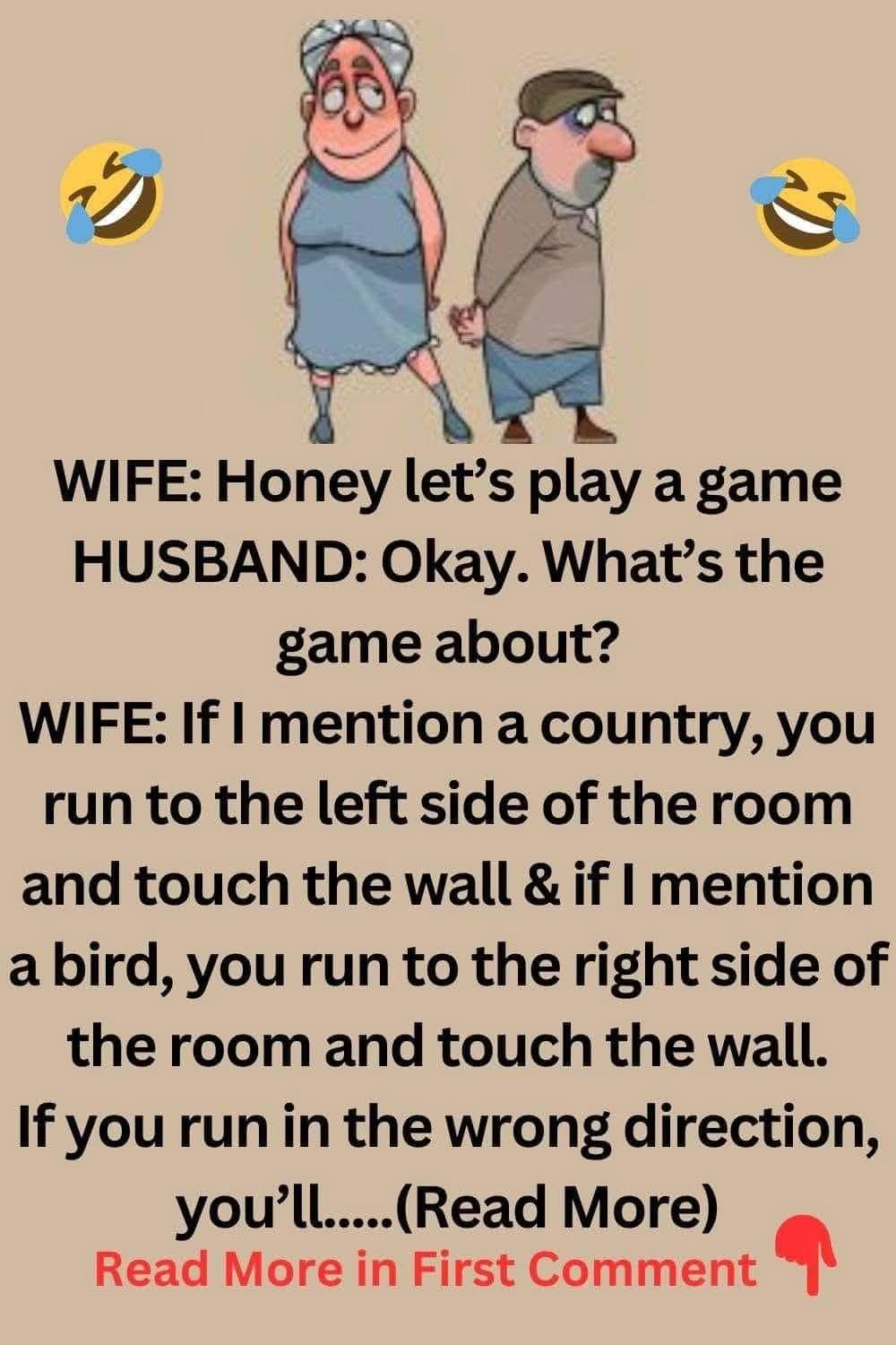 WIFE: If I mention a country, you run to the left side of the room and touch the wall & if I mention a bird, you run to the right side of the room and touch the wall.