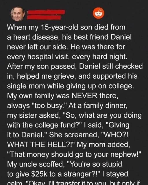 Grief has a way of showing you who your people are. When my son died, the phone calls from my family slowly stopped, but his best friend, Daniel, never left. He became a son to me in every way that mattered, helping me navigate my loss while juggling responsibilities that forced him to postpone his dreams. The divide became painfully clear at a family dinner where I announced I was giving my son’s college fund to Daniel. The reaction was immediate and vicious. They called him a stranger and demanded the money for my nephew. I asked them a simple question about their own presence in my son’s life, and their inability to answer told me everything I needed to know.