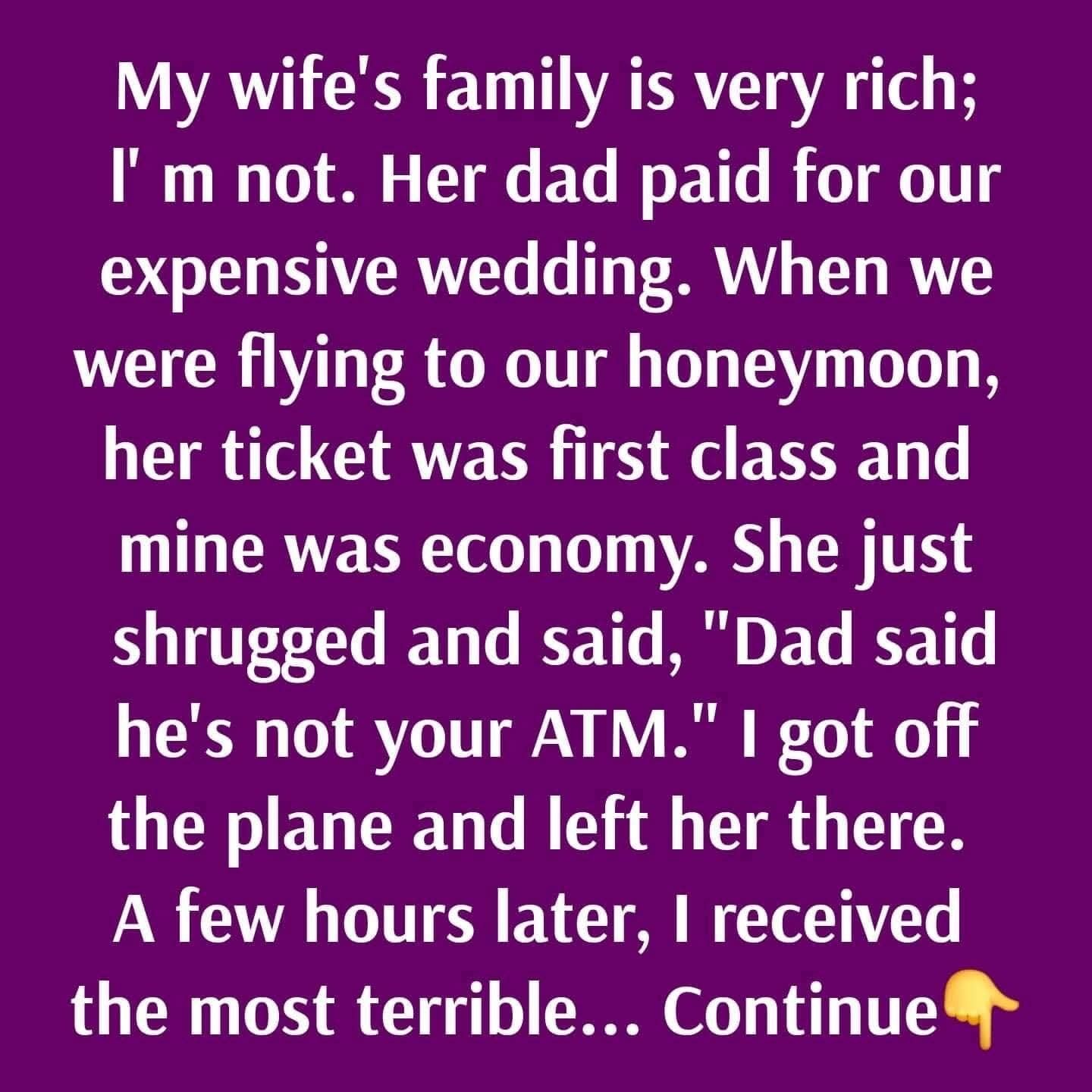 I told him I won’t accept being treated this way just because I’m not wealthy, then I hung up. My wife tried to get me to catch a later flight for the honeymoon, but I refused, so she came back home to talk.
